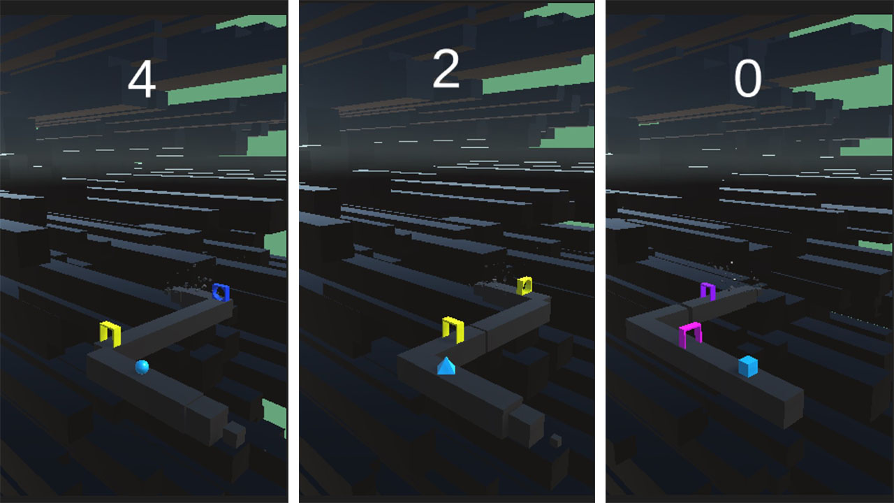 Ihr Ziel ist es, den Spieler so zu positionieren, dass er in das Hindernis passt. Wenn der Spieler jedoch mit einem Hindernis kollidiert, das eine andere Form als der Spieler hat, ist das Spiel vorbei.
